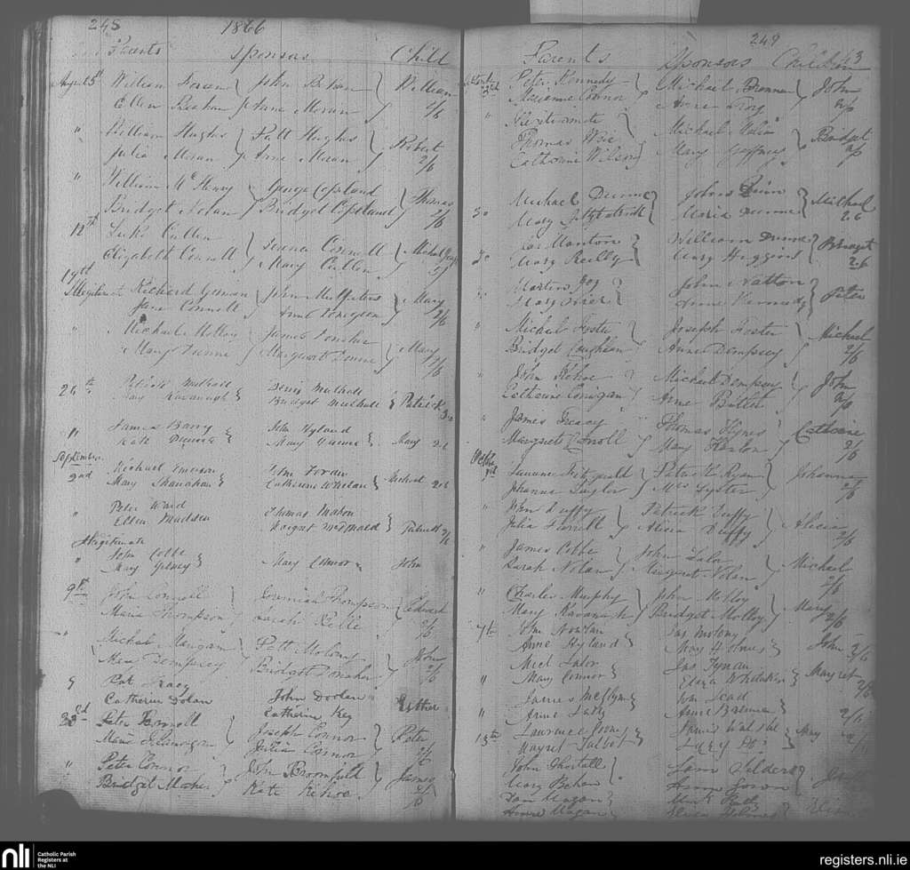 Portarlington; County of Laois, Offaly; Diocese of Kildare and Leighlin. Baptisms, Aug. 1866 to Oct. 1866