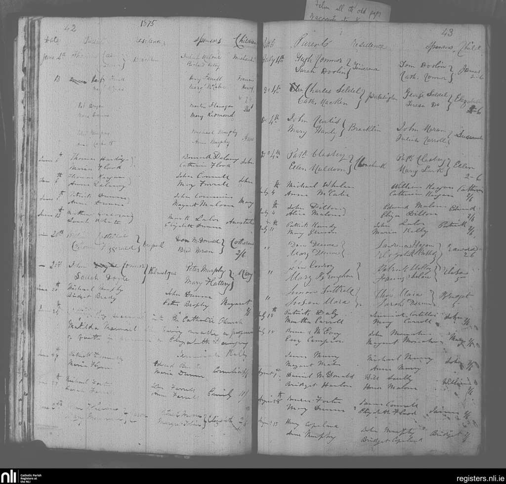 Portarlington; County of Laois, Offaly; Diocese of Kildare and Leighlin. Baptisms, June 1875 to Aug. 1875