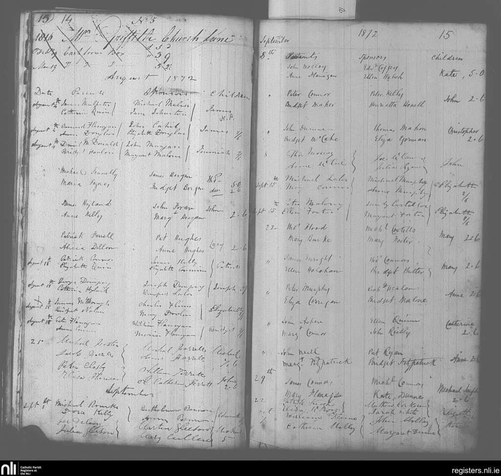 Portarlington; County of Offaly, Laois; Diocese of Kildare and Leighlin. Baptisms, Aug. 1872 to Oct. 1872