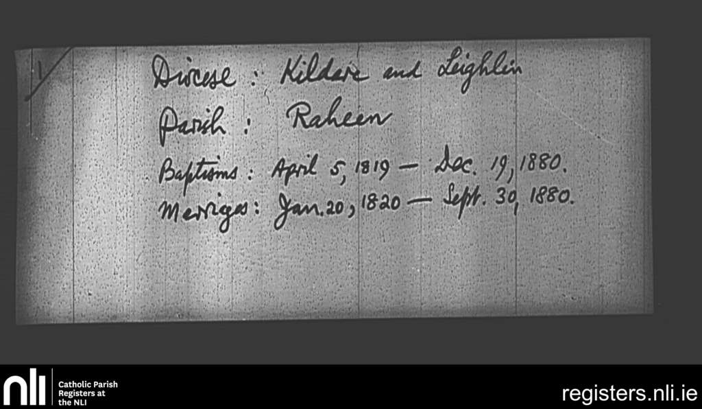 Raheen; County of Laois; Diocese of Kildare and Leighlin. Baptisms, Marriages