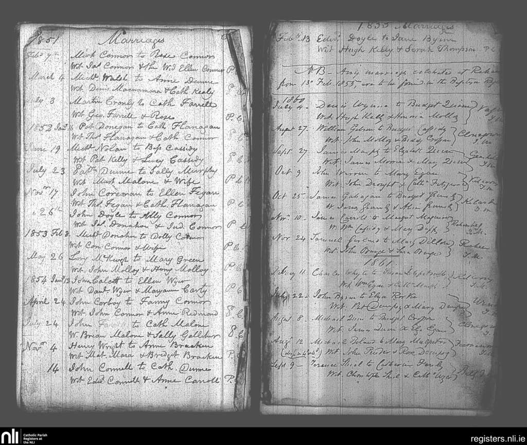 Raheen; County of Laois; Diocese of Kildare and Leighlin. Marriages, Feb. 1851 to Sep. 1861
