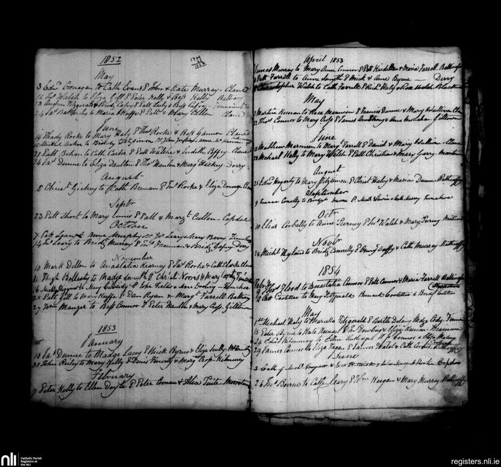 Clane; County of Kildare; Diocese of Kildare and Leighlin. Marriages, May 1852 to June 1854