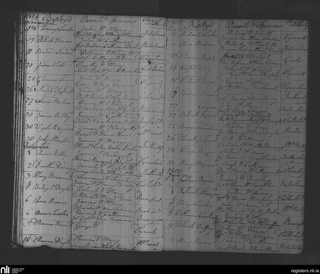 Rathvilly; County of Wicklow, Carlow; Diocese of Kildare and Leighlin. Baptisms, Nov. 1804 to Jan. 1805