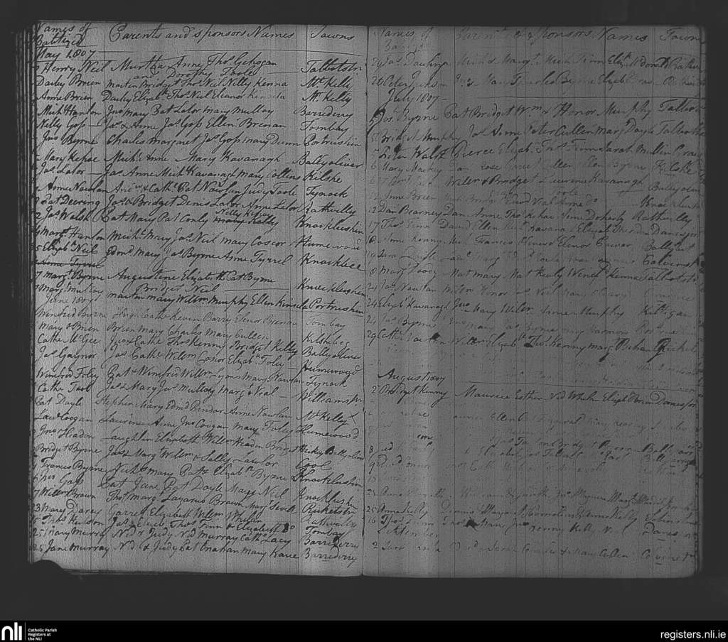 Rathvilly; County of Wicklow, Carlow; Diocese of Kildare and Leighlin. Baptisms, May 1807 to Aug. 1807