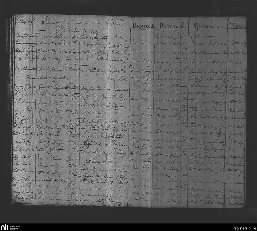 Rathvilly; County of Wicklow, Carlow; Diocese of Kildare and Leighlin. Baptisms, Dec. 1809 to Feb. 1810