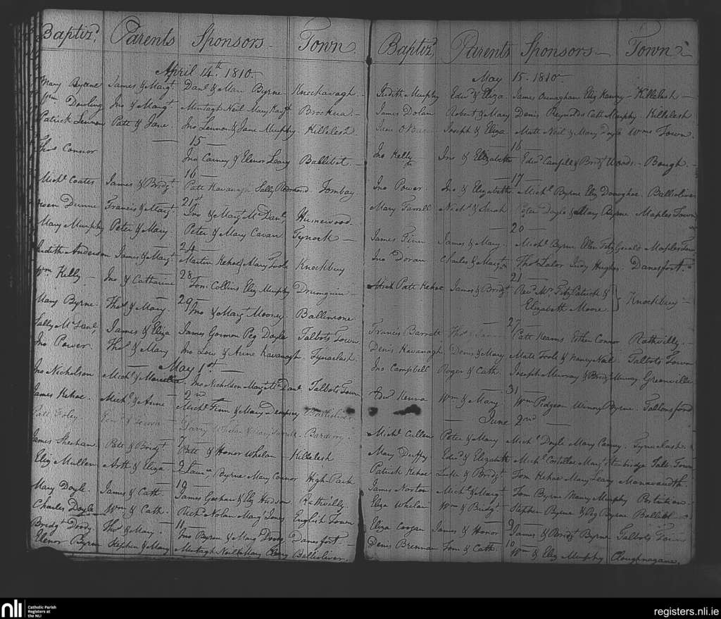 Rathvilly; County of Wicklow, Carlow; Diocese of Kildare and Leighlin. Baptisms, Apr. 1810 to June 1810