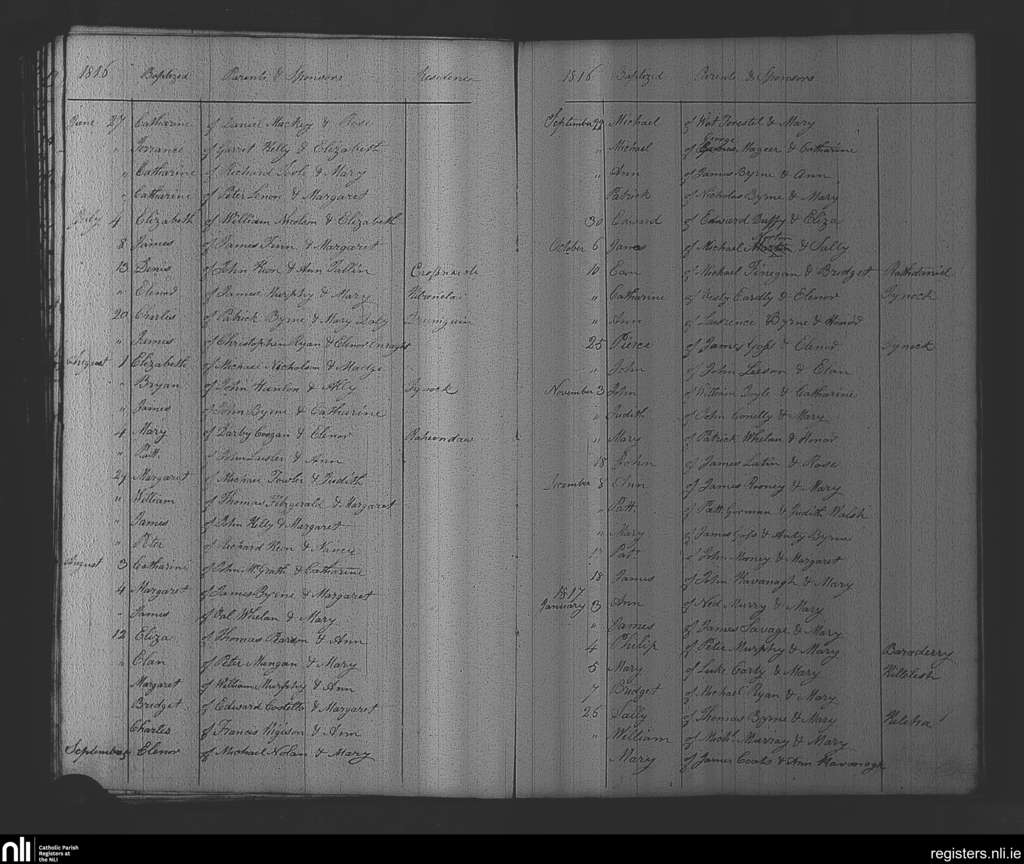 Rathvilly; County of Wicklow, Carlow; Diocese of Kildare and Leighlin. Baptisms, June 1816 to Jan. 1817