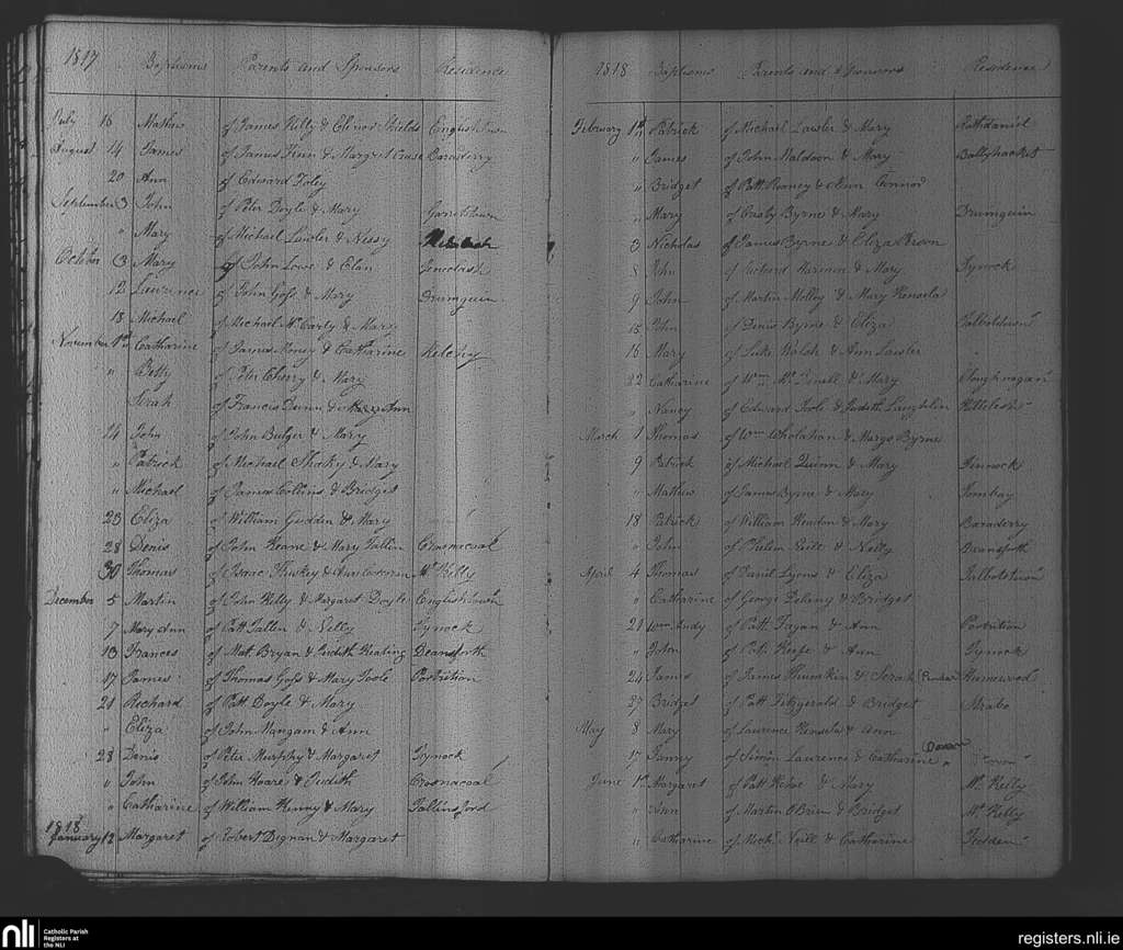 Rathvilly; County of Wicklow, Carlow; Diocese of Kildare and Leighlin. Baptisms, July 1817 to June 1818