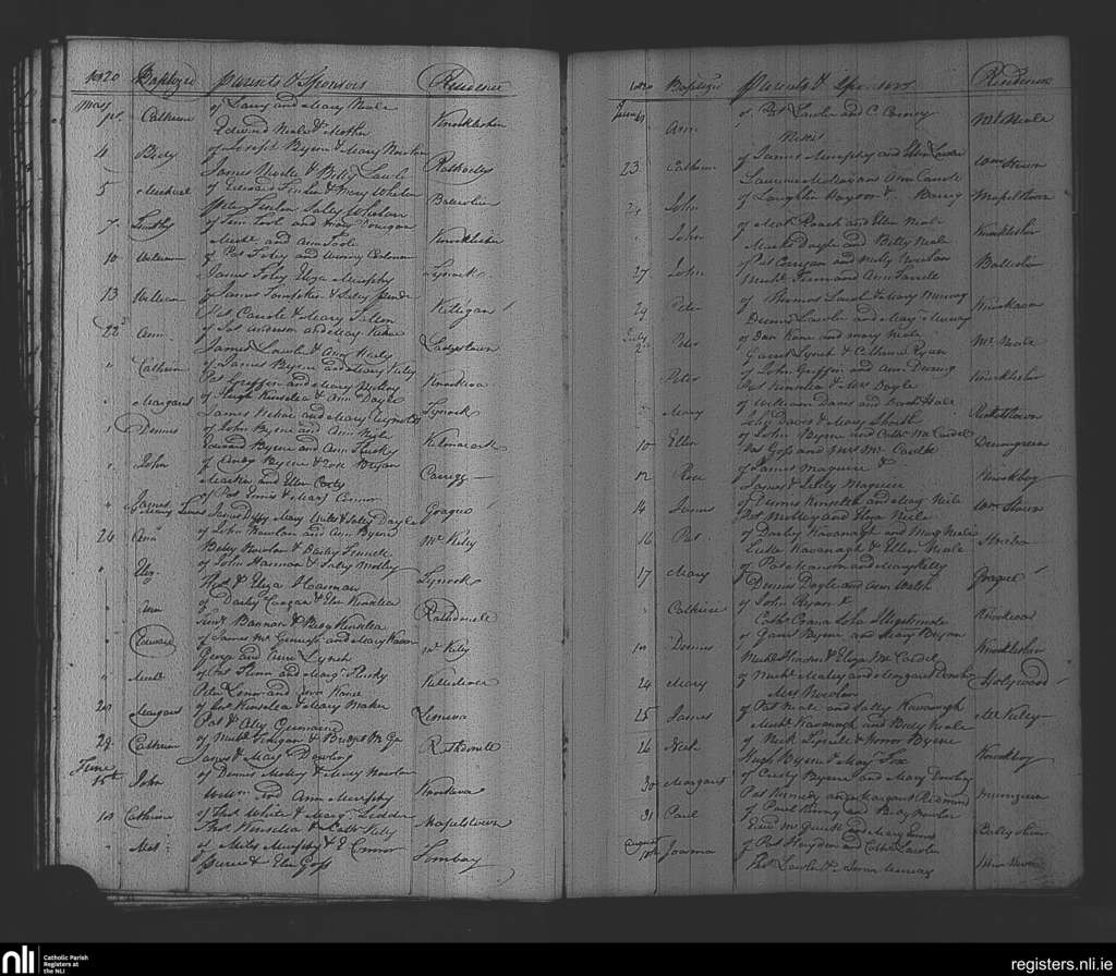 Rathvilly; County of Wicklow, Carlow; Diocese of Kildare and Leighlin. Baptisms, May 1820 to Aug. 1820