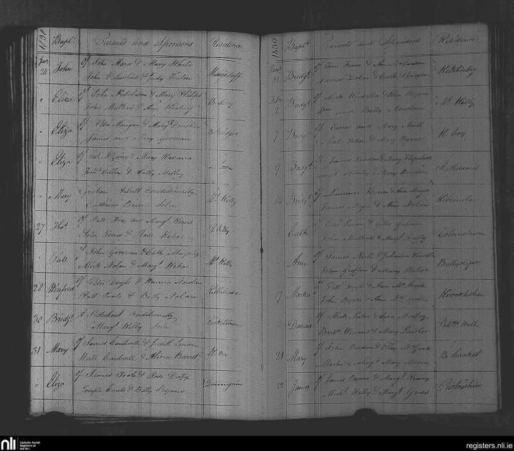 Rathvilly; County of Wicklow, Carlow; Diocese of Kildare and Leighlin. Baptisms, Jan. 1830 to Feb. 1830