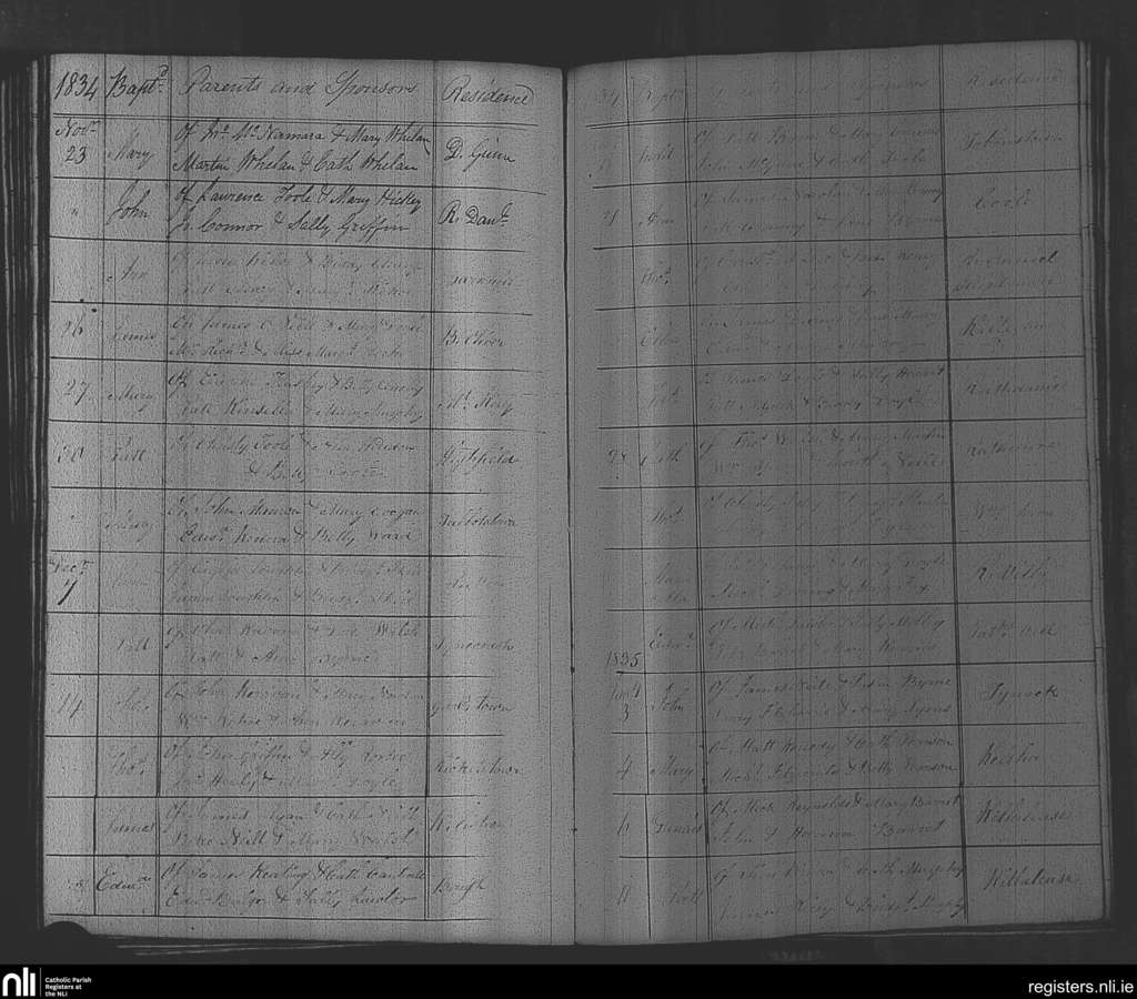 Rathvilly; County of Wicklow, Carlow; Diocese of Kildare and Leighlin. Baptisms, Nov. 1834 to Jan. 1835
