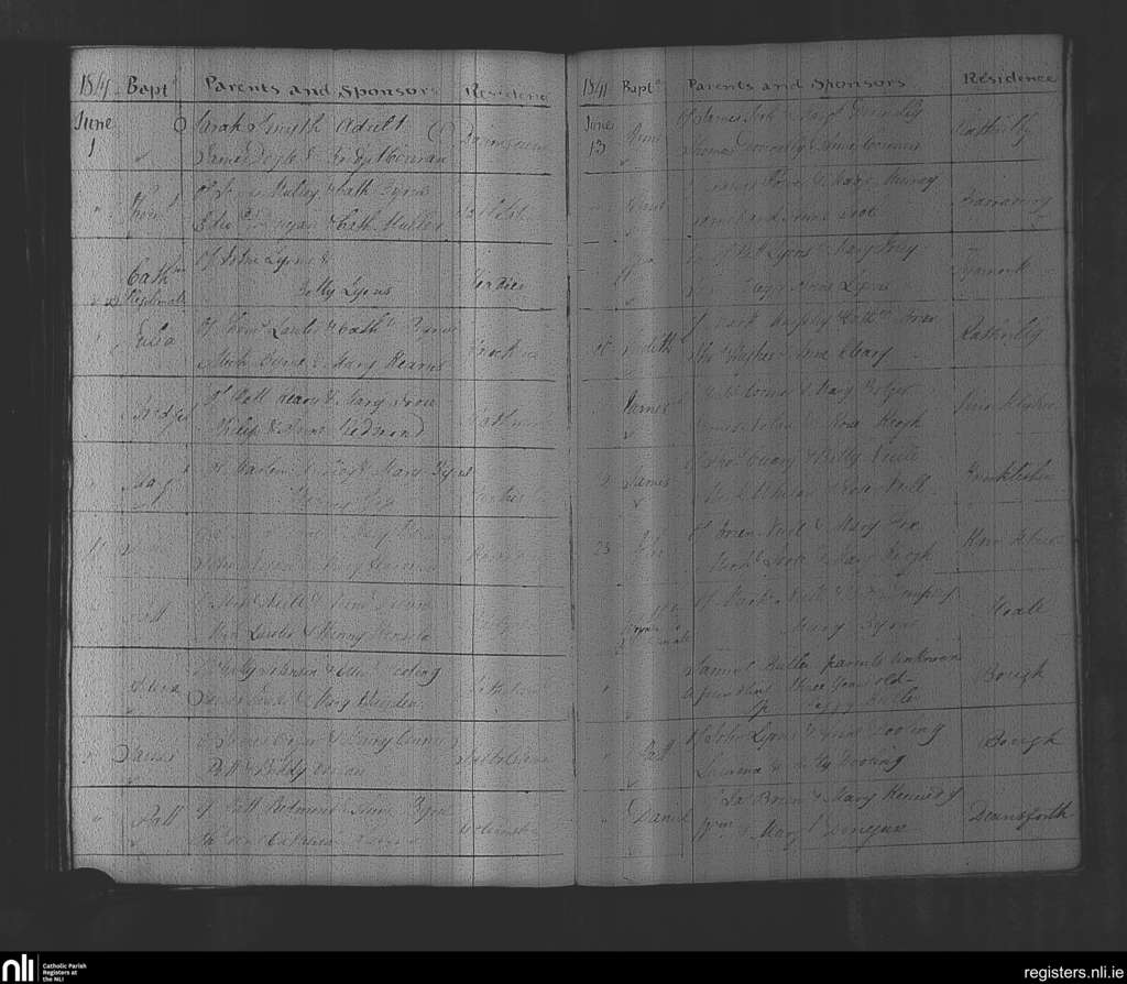 Rathvilly; County of Wicklow, Carlow; Diocese of Kildare and Leighlin. Baptisms, June 1841