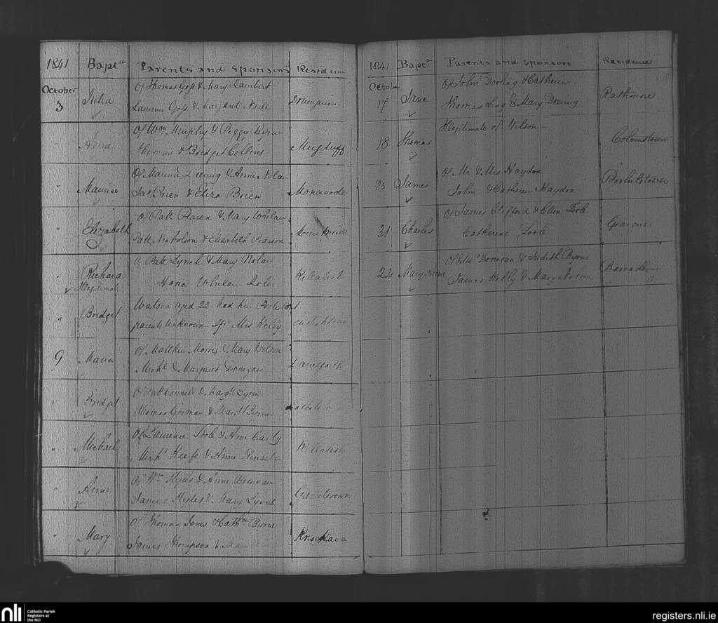 Rathvilly; County of Wicklow, Carlow; Diocese of Kildare and Leighlin. Baptisms, Oct. 1841