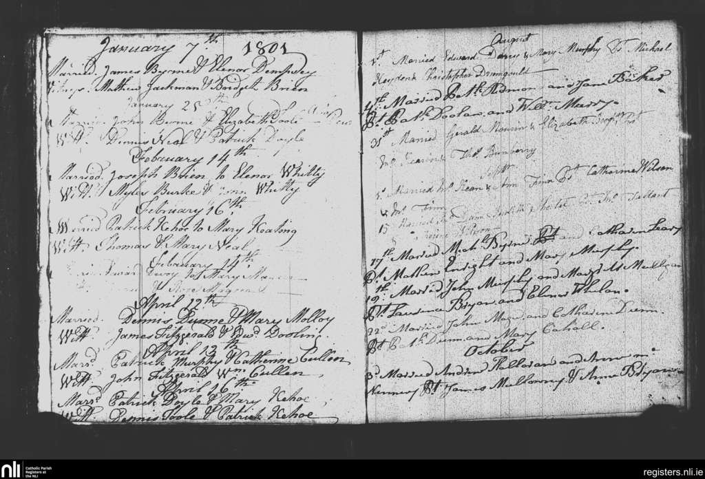 Rathvilly; County of Wicklow, Carlow; Diocese of Kildare and Leighlin. Marriages, Jan. 1801 to Oct. 1801