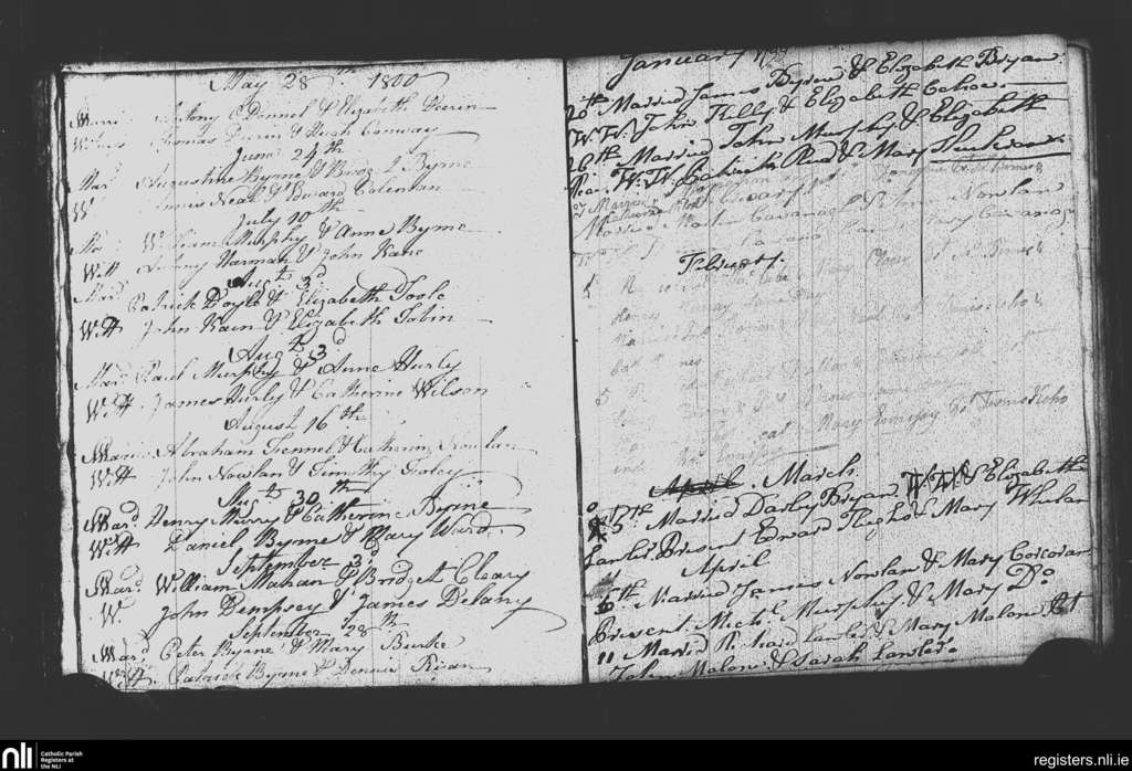 Rathvilly; County of Wicklow, Carlow; Diocese of Kildare and Leighlin. Marriages, May 1800 to Apr. 1801
