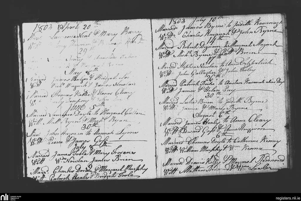 Rathvilly; County of Wicklow, Carlow; Diocese of Kildare and Leighlin. Marriages, Apr. 1803 to Aug. 1803