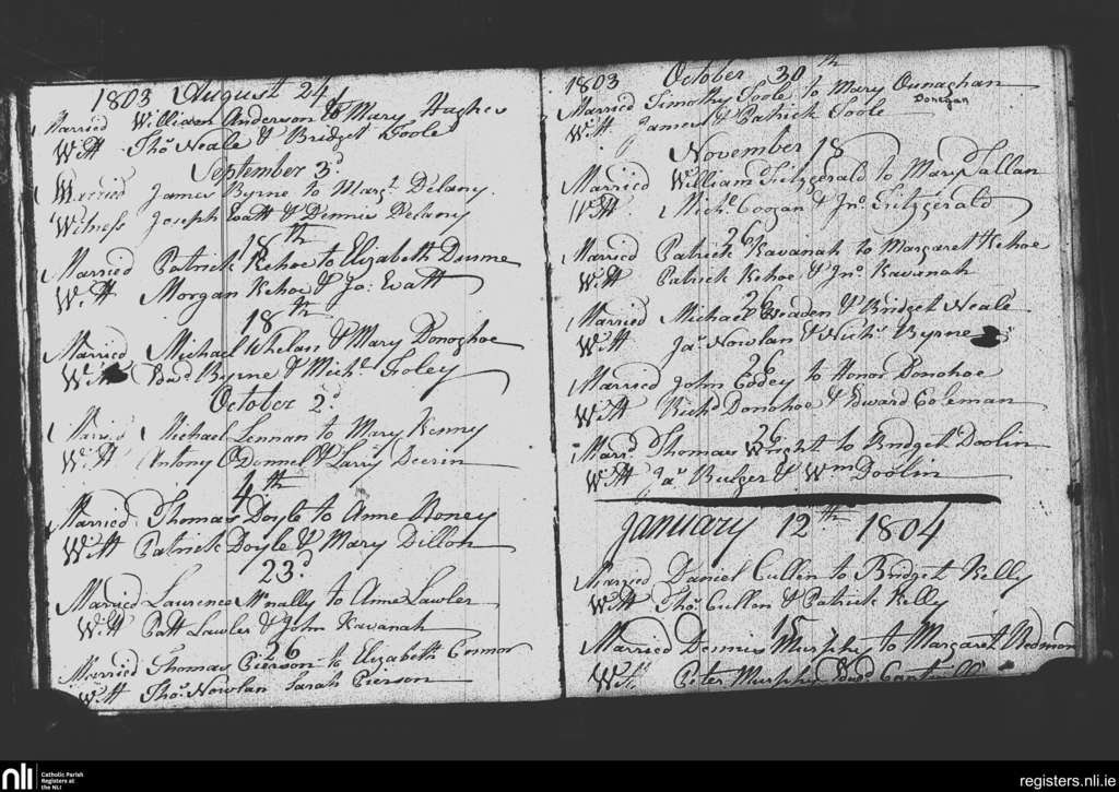 Rathvilly; County of Wicklow, Carlow; Diocese of Kildare and Leighlin. Marriages, Aug. 1803 to Jan. 1804