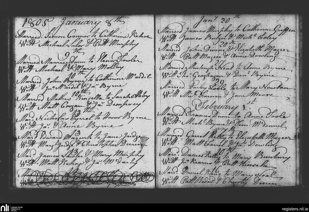 Rathvilly; County of Wicklow, Carlow; Diocese of Kildare and Leighlin. Marriages, Jan. 1805 to Feb. 1805