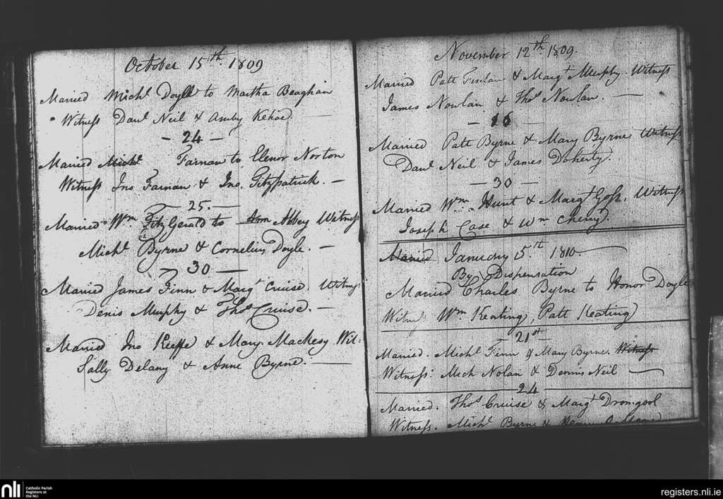 Rathvilly; County of Wicklow, Carlow; Diocese of Kildare and Leighlin. Marriages, Oct. 1809 to Jan. 1810