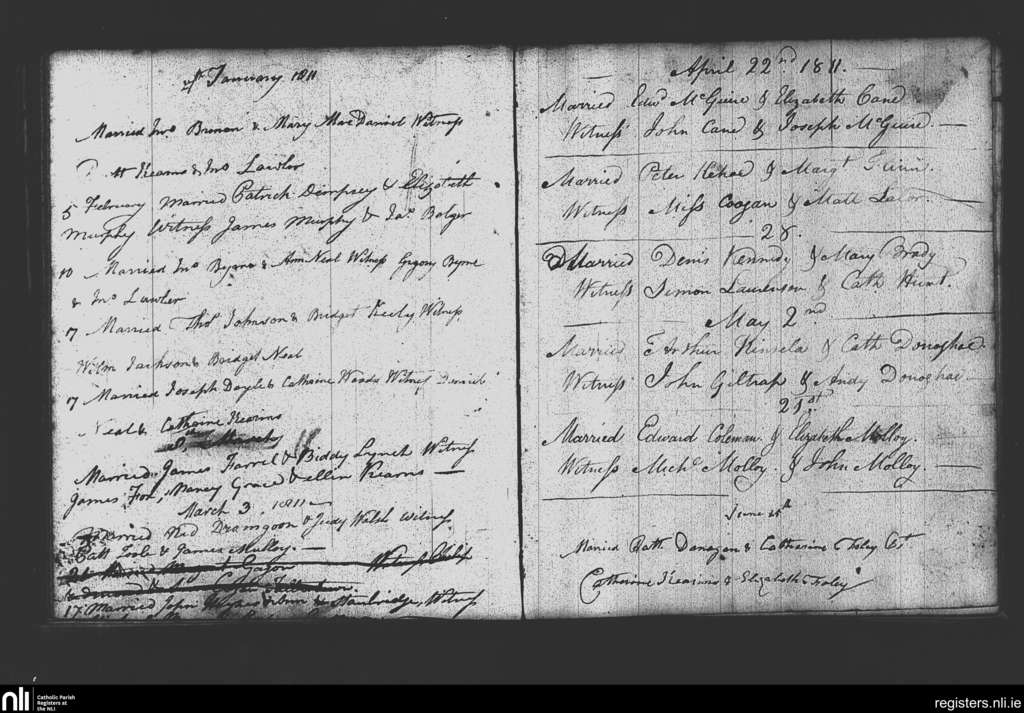 Rathvilly; County of Wicklow, Carlow; Diocese of Kildare and Leighlin. Marriages, Jan. 1811 to June 1811