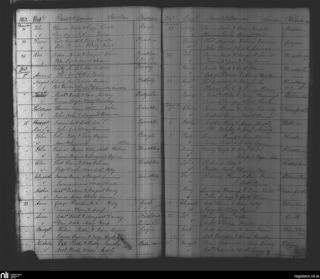 Rathvilly; County of Carlow, Wicklow; Diocese of Kildare and Leighlin. Baptisms, Dec. 1842 to Feb. 1843
