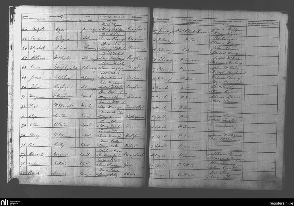 Rhode; County of Offaly; Diocese of Kildare and Leighlin. Baptisms, Jan. 1867 to May 1867