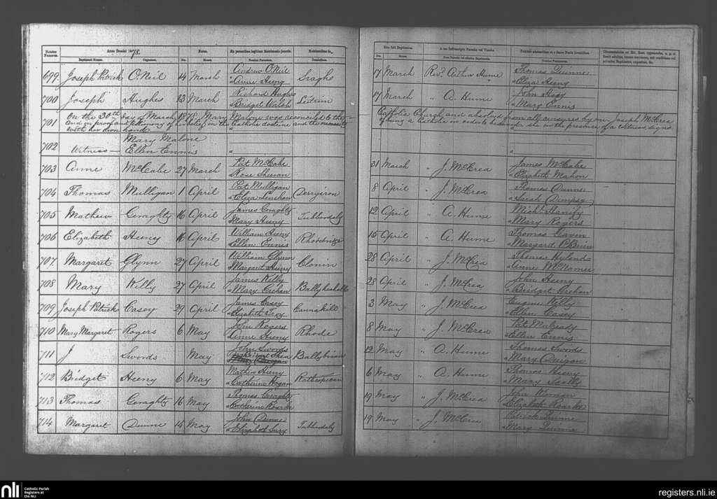 Rhode; County of Offaly; Diocese of Kildare and Leighlin. Baptisms, Mar. 1878 to May 1878