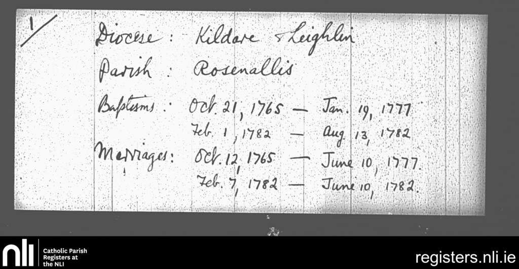 Rosenallis; County of Laois; Diocese of Kildare and Leighlin. Baptisms, Marriages