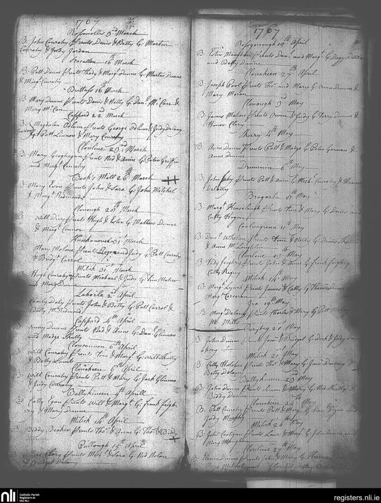 Rosenallis; County of Laois; Diocese of Kildare and Leighlin. Baptisms, Mar. 1767 to May 1767