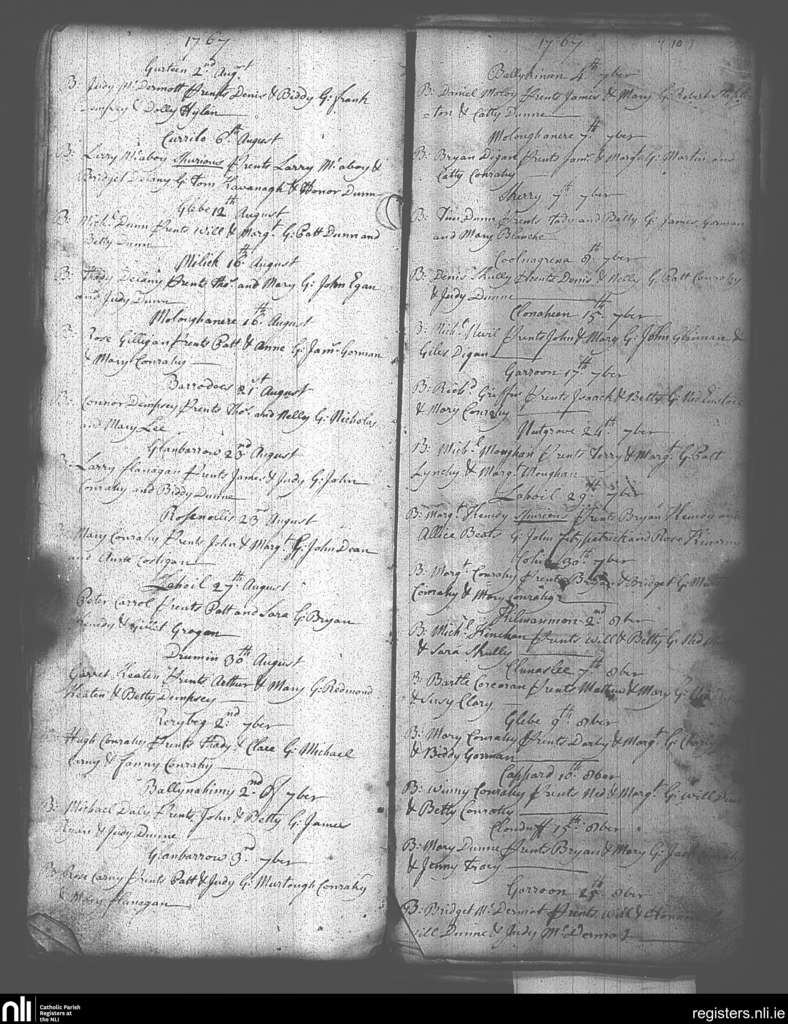 Rosenallis; County of Laois; Diocese of Kildare and Leighlin. Baptisms, Aug. 1767 to Oct. 1767