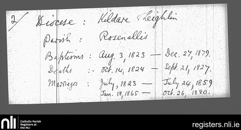 Rosenallis; County of Laois; Diocese of Kildare and Leighlin. Baptisms, Deaths, Marriages