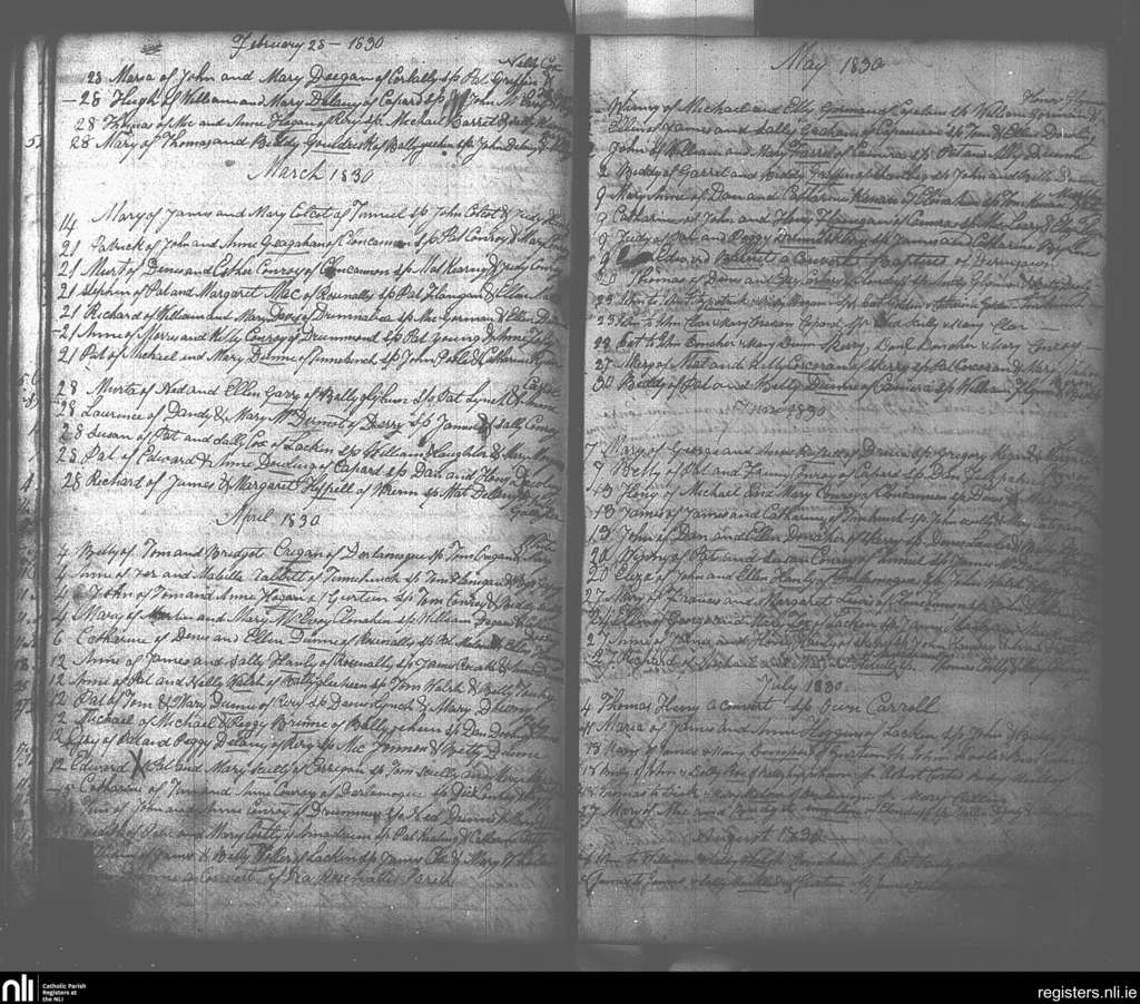 Rosenallis; County of Laois; Diocese of Kildare and Leighlin. Baptisms, Feb. 1830 to July 1830