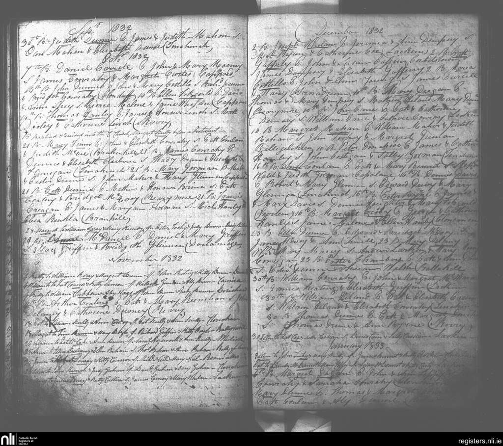 Rosenallis; County of Laois; Diocese of Kildare and Leighlin. Baptisms, Sep. 1832 to Jan. 1833