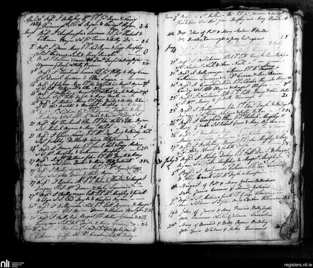 St. Mullins; County of Wexford, Carlow; Diocese of Kildare and Leighlin. Baptisms, Apr. 1824 to July 1824