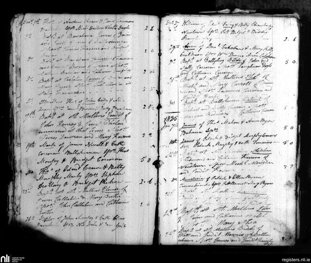 St. Mullins; County of Wexford, Carlow; Diocese of Kildare and Leighlin. Baptisms, Dec. 1824 to Jan. 1825