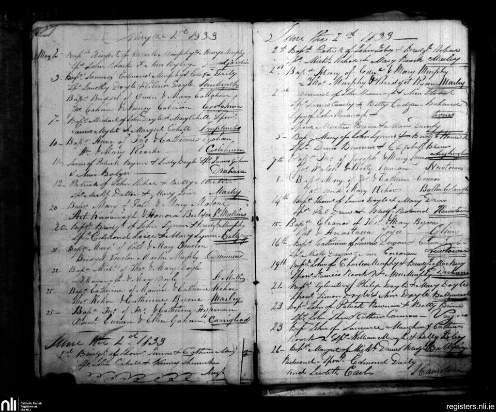 St. Mullins; County of Carlow, Wexford; Diocese of Kildare and Leighlin. Baptisms, May 1833 to June 1833
