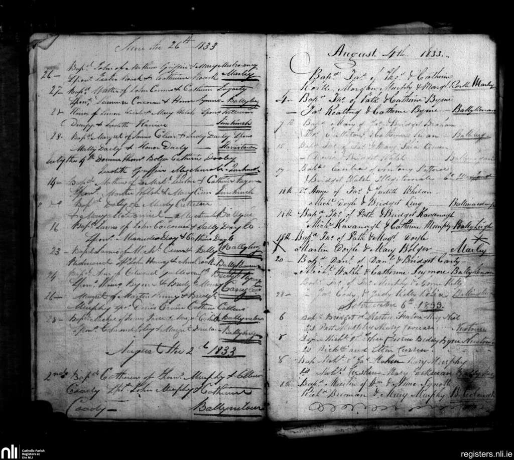 St. Mullins; County of Carlow, Wexford; Diocese of Kildare and Leighlin. Baptisms, June 1833 to Sep. 1833