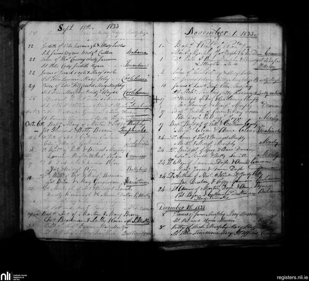 St. Mullins; County of Carlow, Wexford; Diocese of Kildare and Leighlin. Baptisms, Sep. 1833 to Dec. 1833