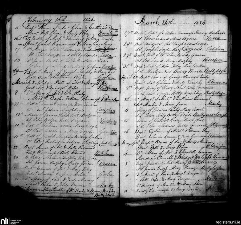 St. Mullins; County of Carlow, Wexford; Diocese of Kildare and Leighlin. Baptisms, Feb. 1834 to May 1834