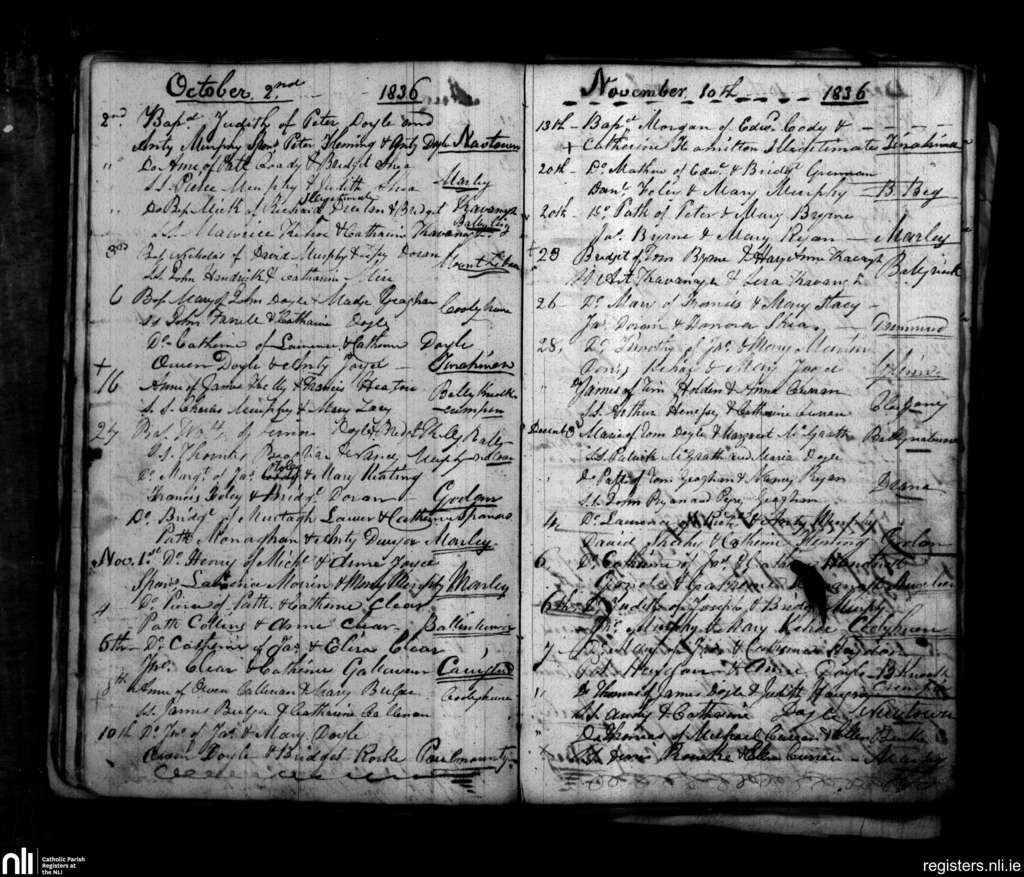 St. Mullins; County of Carlow, Wexford; Diocese of Kildare and Leighlin. Baptisms, Oct. 1836 to Dec. 1836