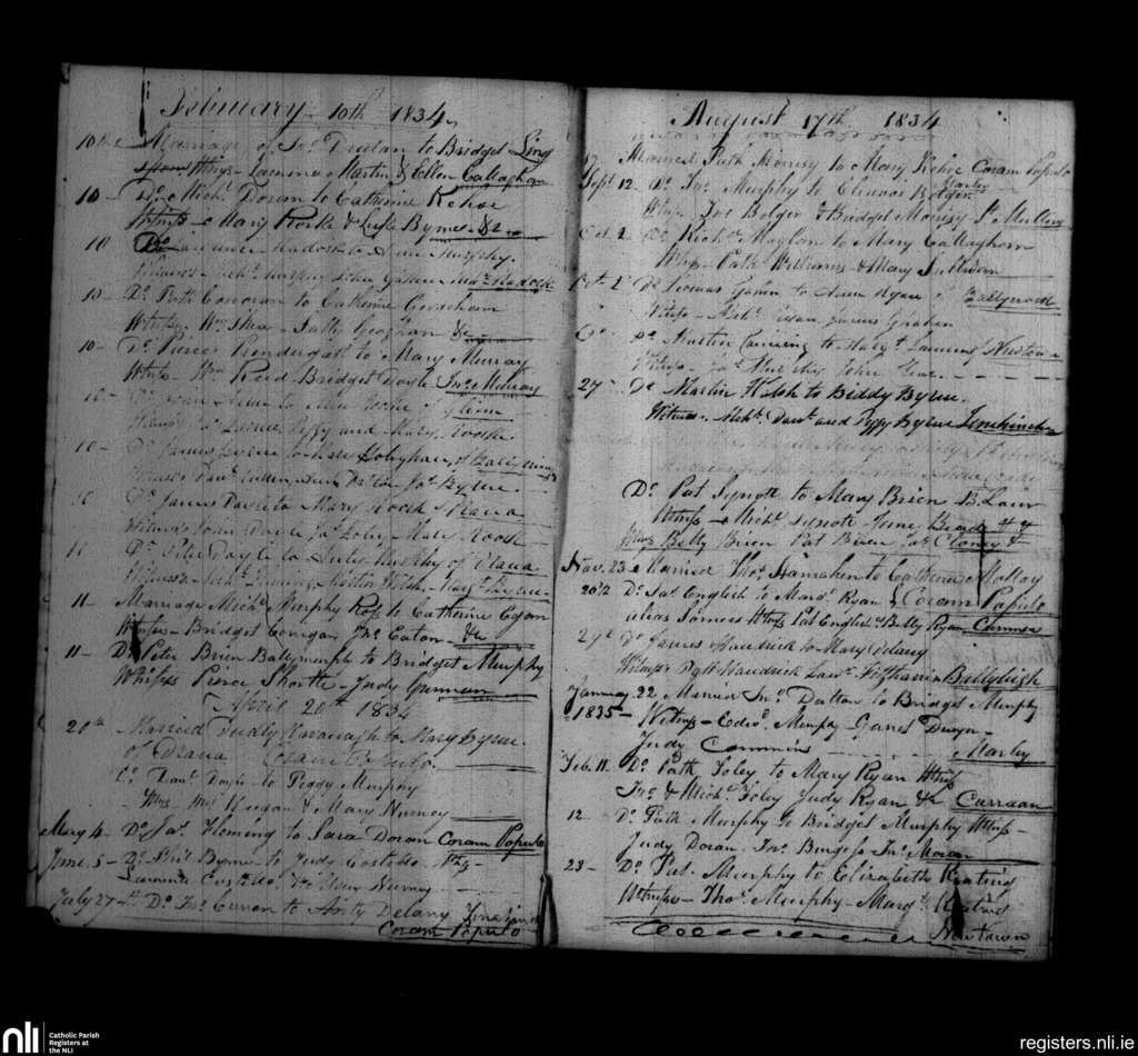 St. Mullins; County of Carlow, Wexford; Diocese of Kildare and Leighlin. Marriages, Feb. 1834 to Feb. 1835