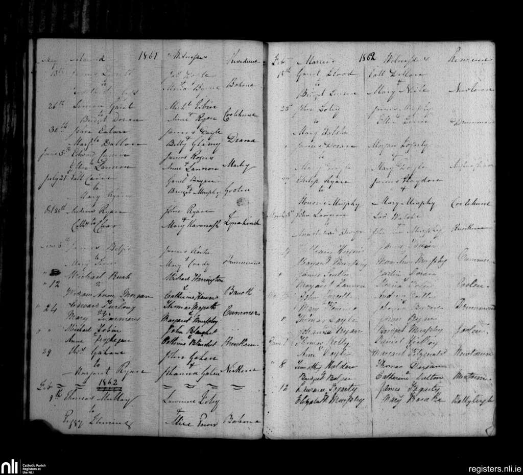 St. Mullins; County of Carlow, Wexford; Diocese of Kildare and Leighlin. Marriages, May 1861 to June 1862