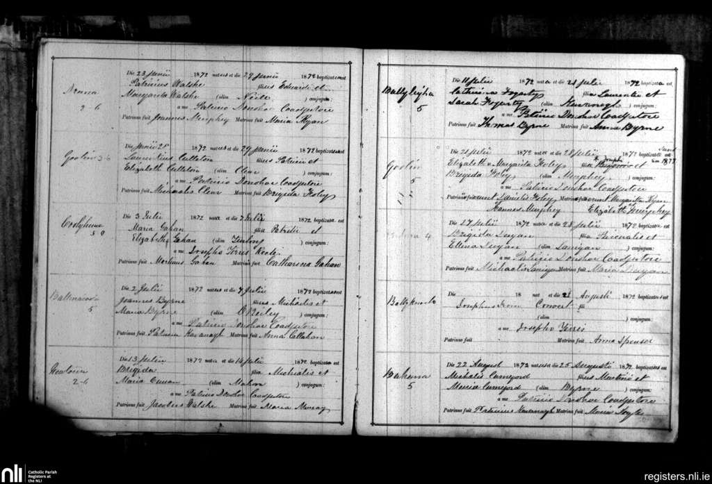 St. Mullins; County of Carlow, Wexford; Diocese of Kildare and Leighlin. Baptisms, June 1872 to Aug. 1872