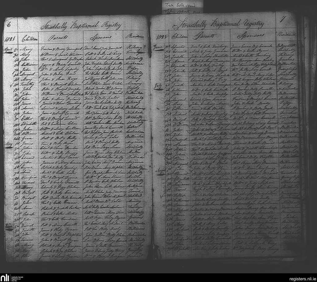 Stradbally; County of Laois; Diocese of Kildare and Leighlin. Baptisms, Apr. 1821 to Aug. 1821