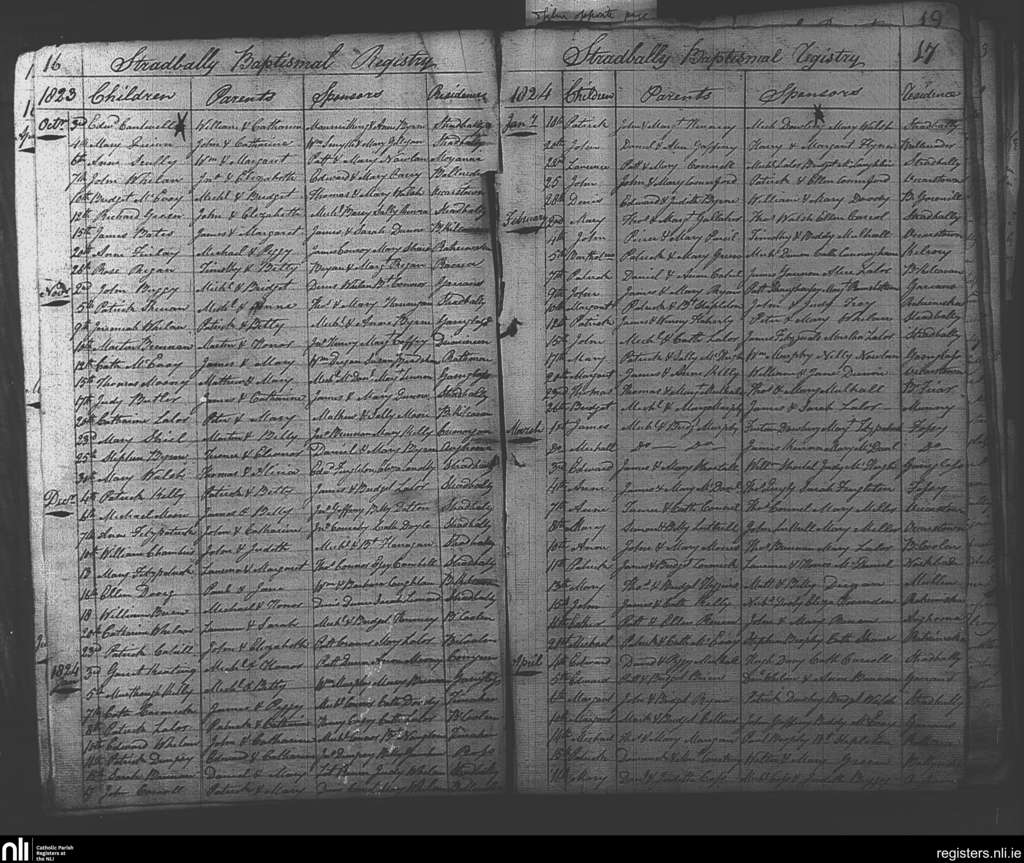 Stradbally; Contae Laois; Deoise Kildare and Leighlin. Baptisms, DF 1823 go dtí an Aib. 1824