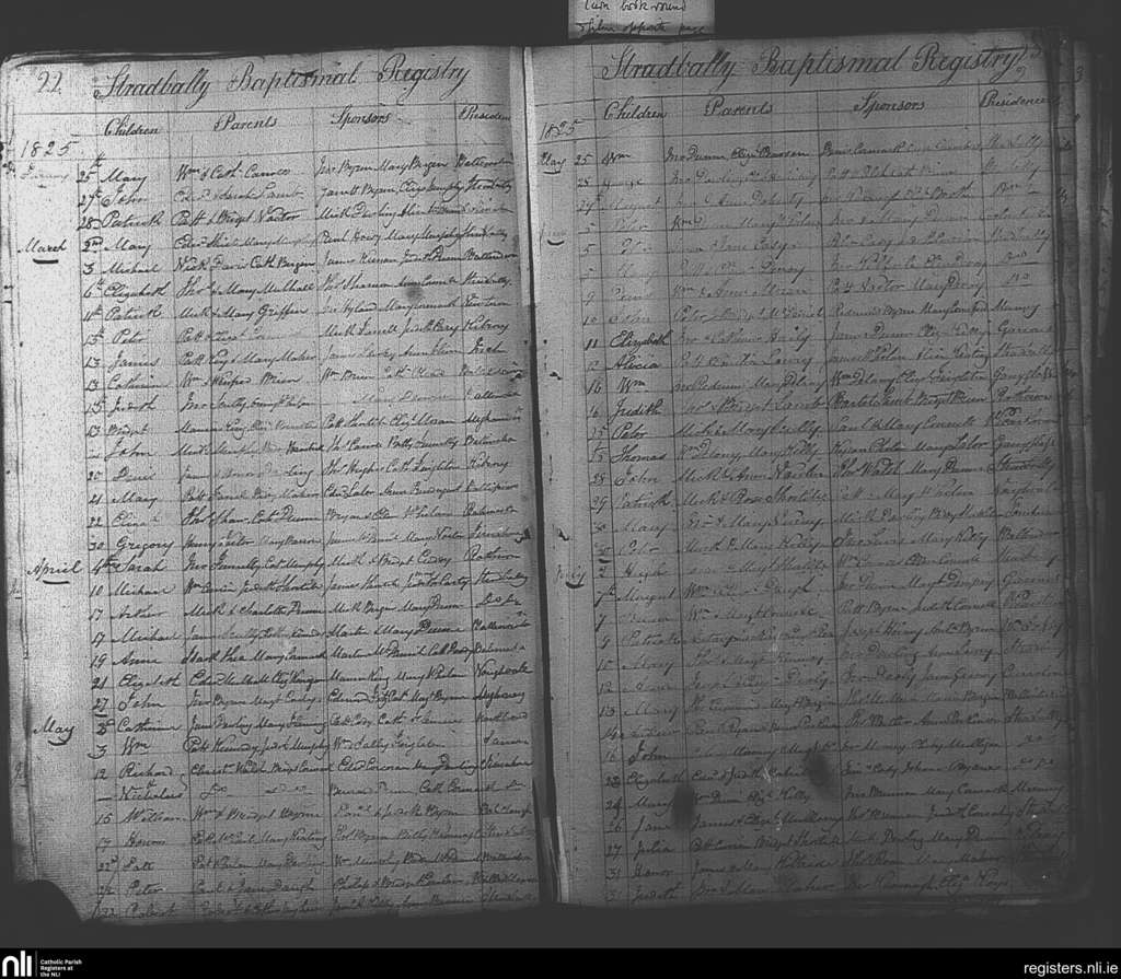 Stradbally; County of Laois; Diocese of Kildare and Leighlin. Baptisms, Feb. 1825 to July 1825