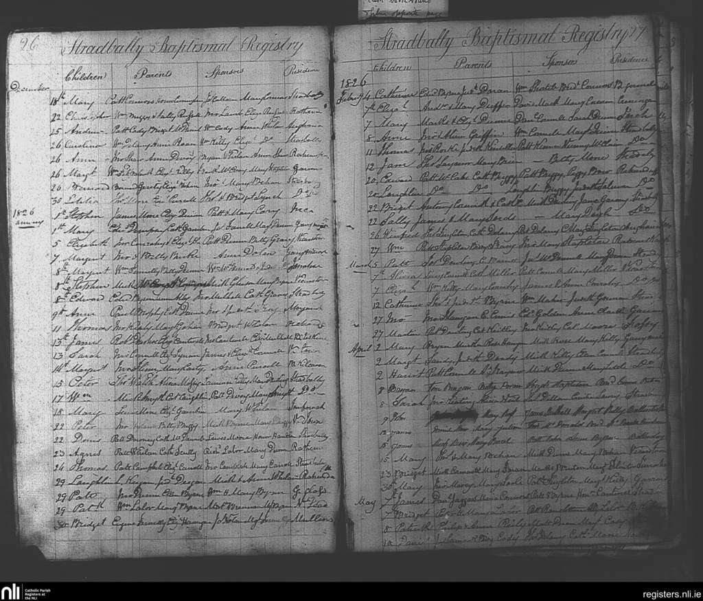 Stradbally; County of Laois; Diocese of Kildare and Leighlin. Baptisms, Dec. 1825 to May 1826
