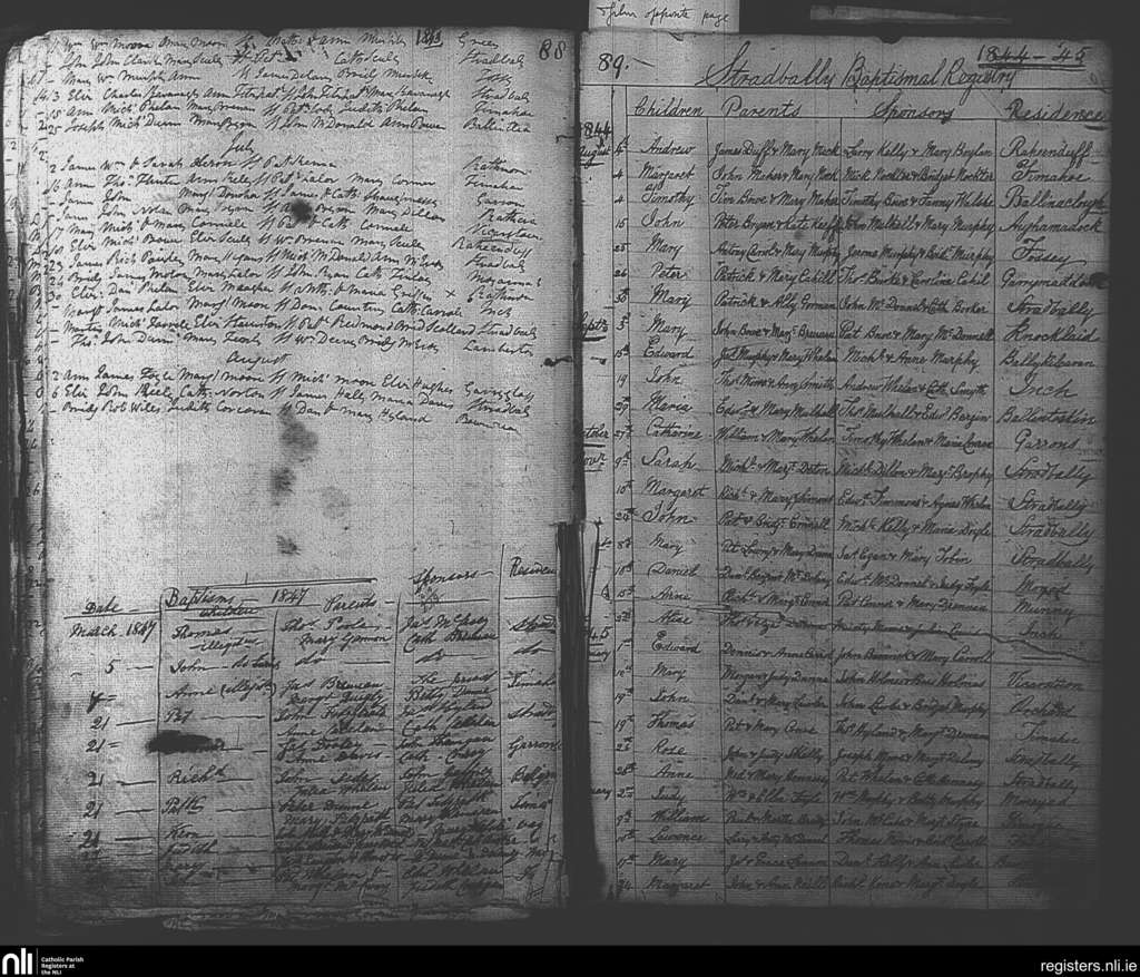 Stradbally; County of Laois; Diocese of Kildare and Leighlin. Baptisms, June 1843 to Mar. 1847