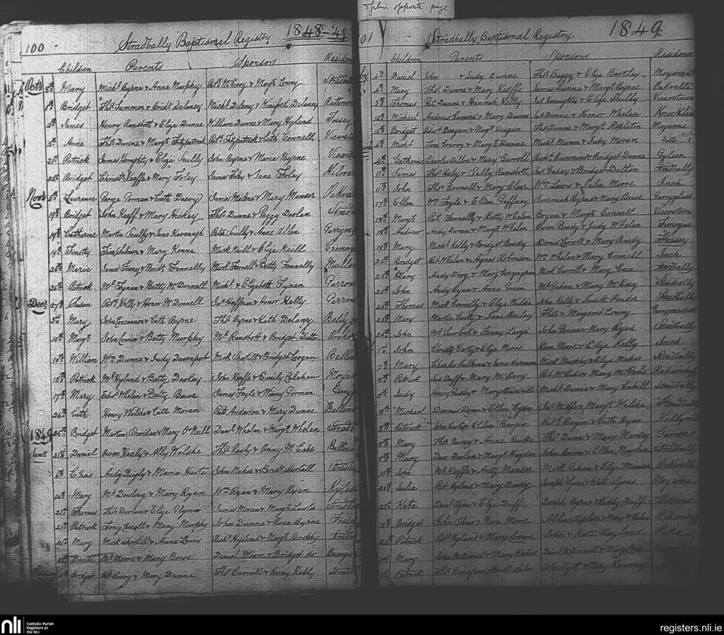Stradbally; County of Laois; Diocese of Kildare and Leighlin. Baptisms, Oct. 1848 to May 1849