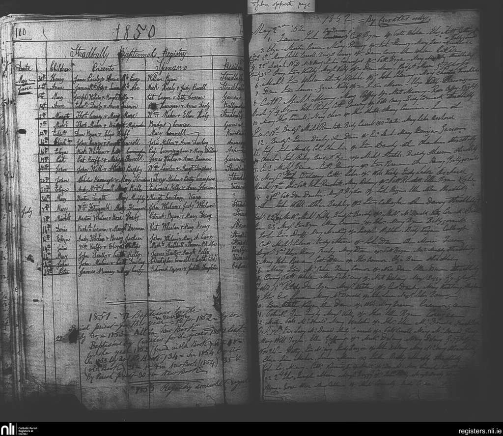 Stradbally; County of Laois; Diocese of Kildare and Leighlin. Baptisms, May 1850 to Dec. 1852